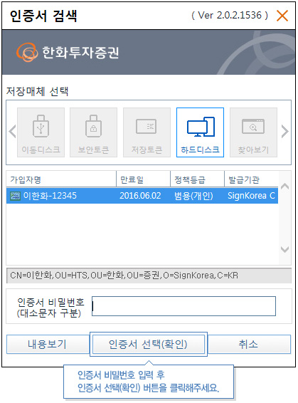 인증서 선택 창이 나오면 폐기할 인증서를 선택한 후 [인증서 선택(확인)] 버튼을 선택합니다.