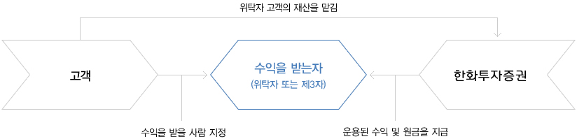 위탁자에게 수익을 받을 권리를 부여받은 수익자(위탁자 또는 제3자)는 수탁자(한화투자증권)에서 운용된 수익 및 원금을 지급받는 형식입니다. - 고객 : 신탁자산(현금 등)을 맡기는 자로 해당 자산의 소유자입니다. (위탁자)