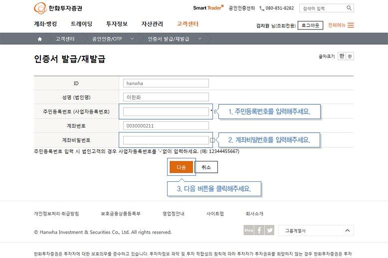 한화투자증권 거래 시 사용할 공인인증서를 발급 받으실 수 있습니다.